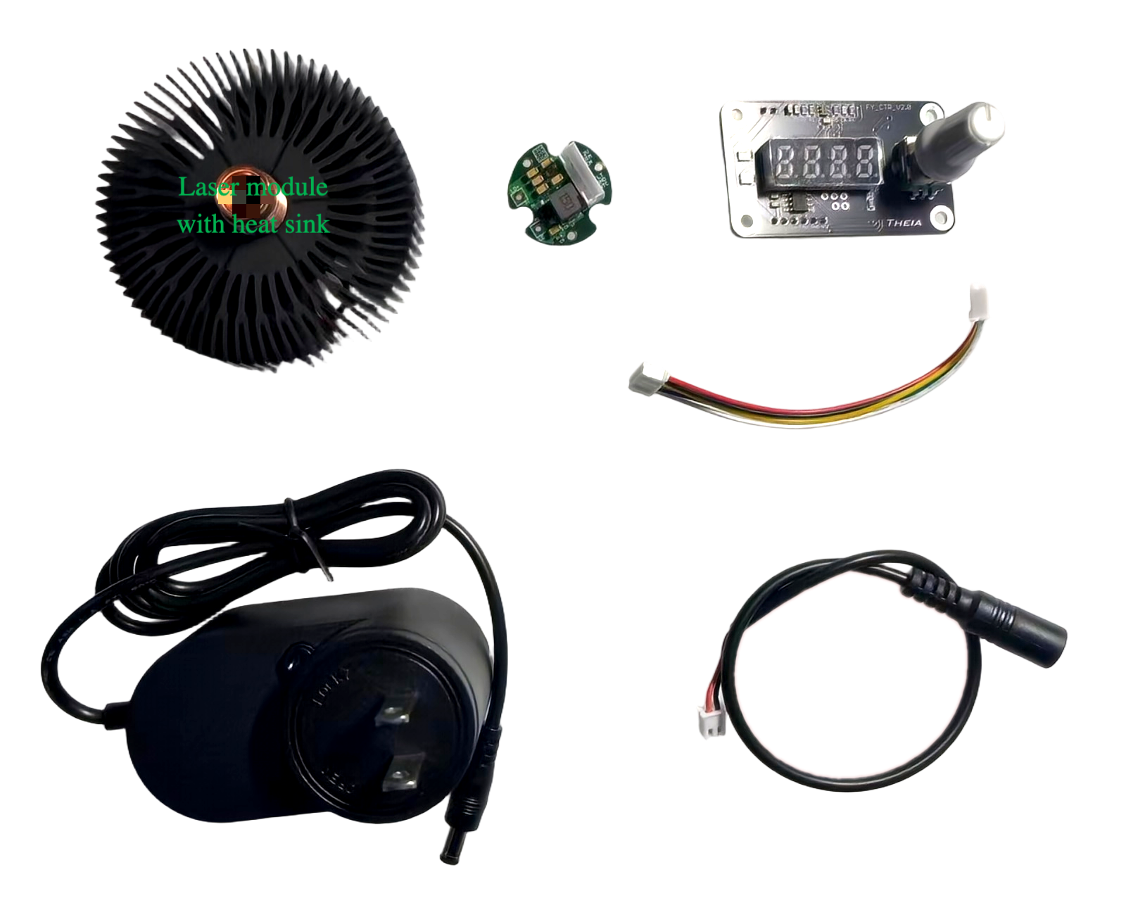 (1) Модуль LEP; (2) Радиатор; (3) Драйвер печатной платы; (4) Адаптер питания; (5) Разъем выключателя питания; (6) Одна часть крышки объектива с линзой, напечатанная на 3D-принтере.